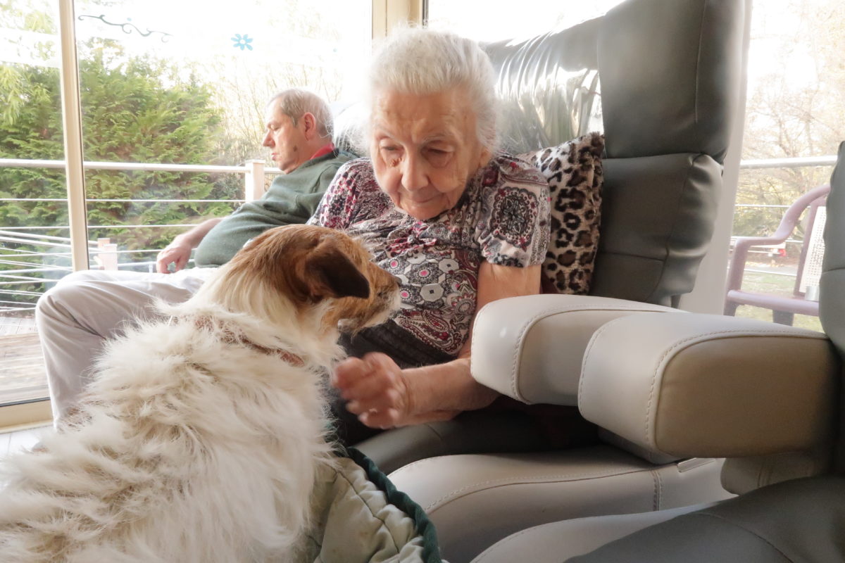 Si vous vous demandez que fait cette jeune fille agenouillée à côté d’un petit Jack Russel, lui trônant sur un siège au bon milieu d’un groupe de résidants, et bien… c’est notre nouvelle intervenante « Patte Tendue».