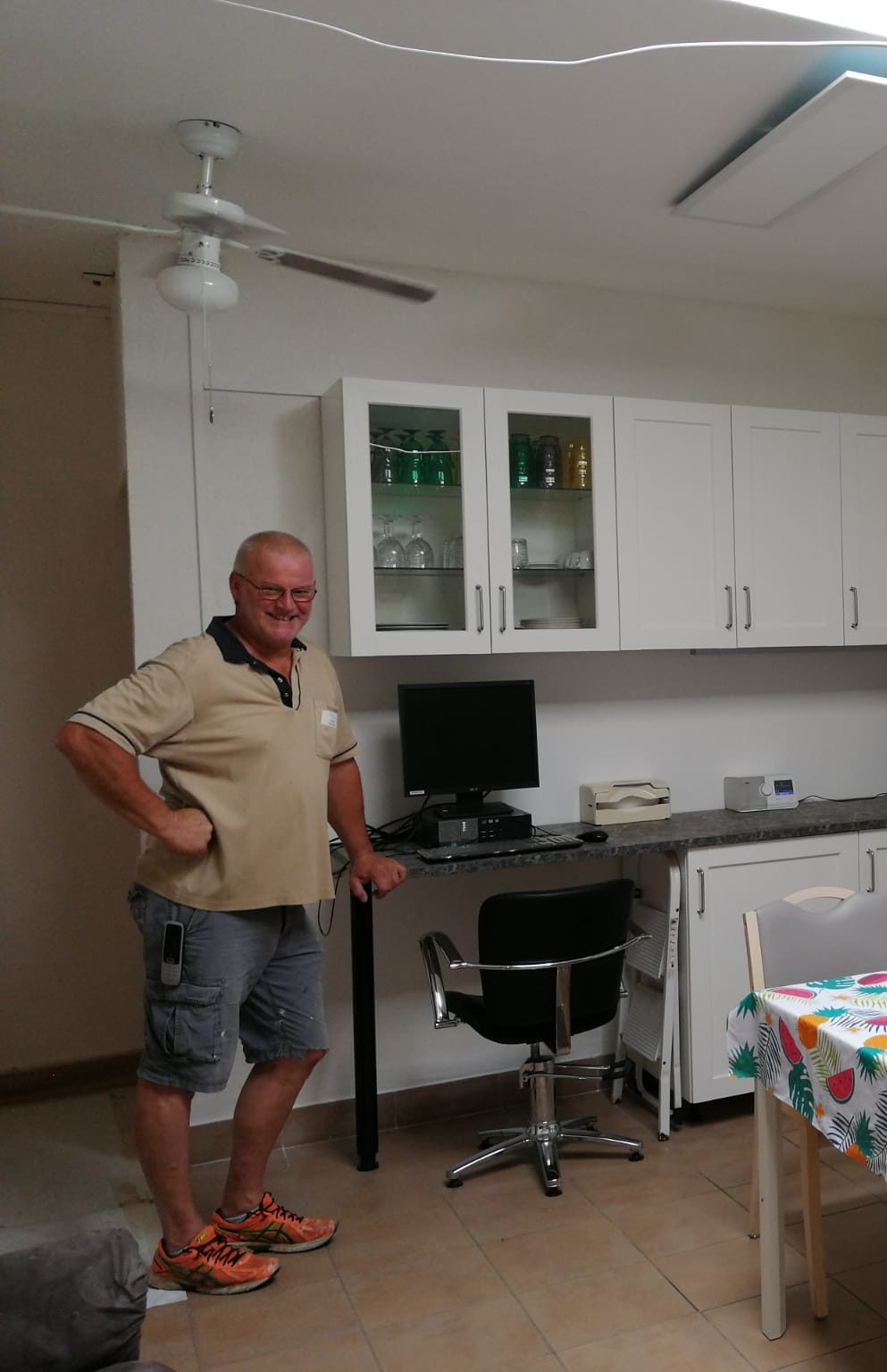 L’aventure a donc commencé dès les premiers cartons livrés, en tout plus de 100 cartons. Un vrai travail d’hercule attendait Stéphane. Durant 2 semaines celui-ci a assemblé et ajusté la grandeur des meubles et réalisé tout le travail électrique et de plomberie. Les visites des résidants curieux et le passage de l’équipe l’ont soutenu et distrait tout ce temps. Les autres membres de l’équipe technique quant à eux, ont aussi contribué en assurant le travail habituel de Stéphane durant ces deux semaines. Un aspect qui a toute son importance pour Stéphane, car celui-ci a pu se consacrer entièrement, à ce projet. Stéphane précise qu’il a dû tailler et adapter les meubles en équerre pour que la cuisine s’adapte à l’espace disponible. C’est un travail sur-mesure, rajoute t’il. Stéphane se dit fière de son travail et bien qu’il reste encore quelques finitions à terminer au niveau des câbles, la cuisine est déjà utilisable et les membres de l’équipe ont déjà investi les lieux.